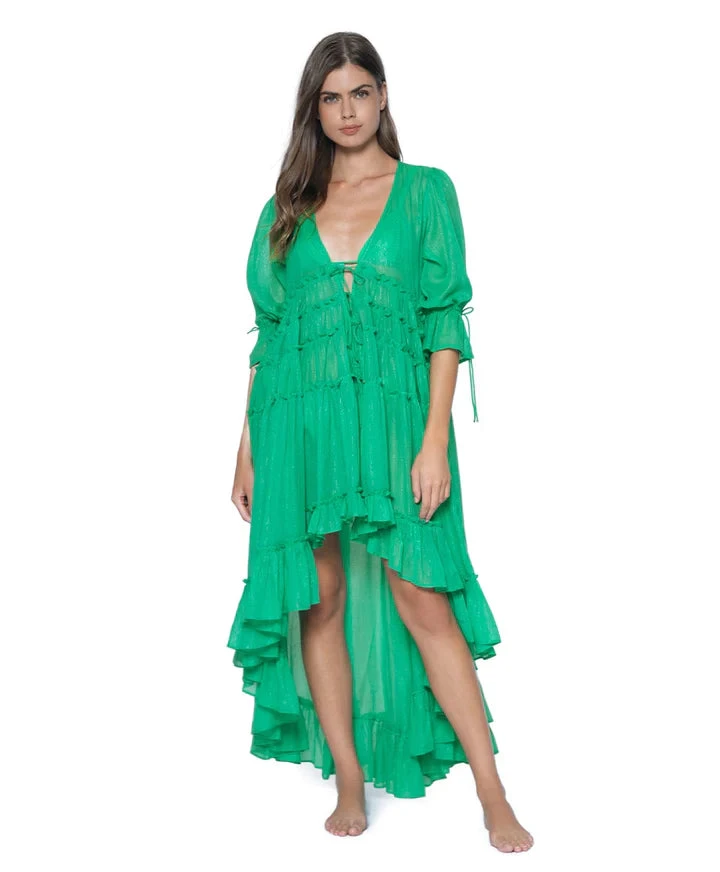 This is the perfect tunic to throw over your favorite PQ suit! Look stunning in this high-low Emerald Bay Kinsley tunic with ruffle trim and mid length sleeves. A Gorgeous addition to your summer beach or pool wardrobe
