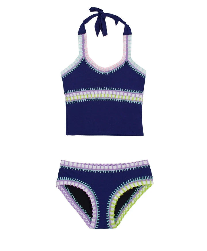 This PQ Swim girls tankini is inspired by Solange Ferrarini. Features an deep blue color, embroidered trim and tie closure in the back. If unsure about what size to pick, size up